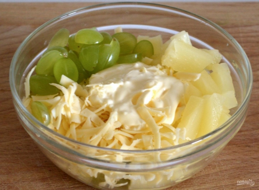 Продукты: Заходите на мой сайт и читайте ещё больше новых рецептов Приготовление: Виноград помыть и разрезать на 2 части - пополам. Ананас нарезать кубиками. Сыр натереть на тёрке. Чеснок почистить и пропустить через пресс. В тарелке смешать все продукты, слегка подсолить и заправить салат майонезом. Перемешать и можно подавать закуску на стол Приятного Аппетита! Подписывайтесь на КАНАЛ и ставьте лайк!