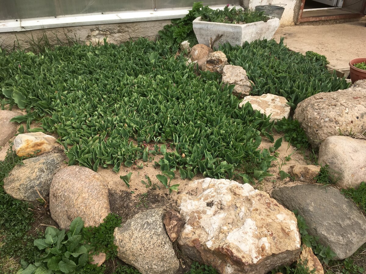 Странно. Недавно я написала статью " О том, как меня выгнали из теплицы, но я успела сделать фотографии". И странно то, что никто не обратил тогда внимания на эту фотографию. Видно же, что здесь посажено огромное количество тюльпанов. Вернее будет сказать, что здесь когда-то давно было посажено ... неизвестное количество тюльпанов, которые много лет никто ( судя по всему) не выкапывал. Должна Вам, уважаемая читательница ( читатель) честно признаться, что я потом долго рассматривала эту фотографию. Я и сделала-то ее только потому, что сразу заметила почти полное отсутствие бутонов. У меня много тюльпанов, и я хорошо изучила их поведение, если их не выкапывать достаточно долго. Посмотрите, возле этой вишни, которая была совсем тоненьким "прутиком" я несколько лет назад посадила три луковицы тюльпана. Вишня выросла, а тюльпаны за эти годы никто ни разу не беспокоил: И у меня таких примеров очень много. Хотя в прежние времена я старалась выкопать и просушить в тени все луковицы. Но потом