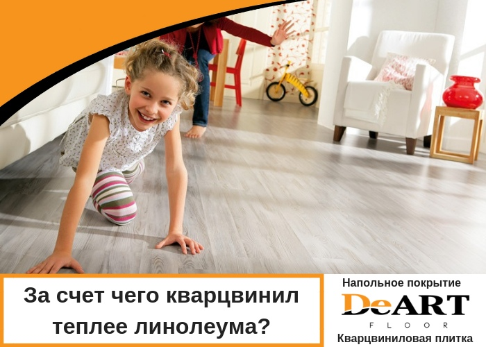 Кварцвиниловая плитка благодаря своему составу (до 70% кварцевого песка) имеет низкую теплопроводность - плохо передает температуру от основания пола, а у линолеума средняя теплопроводность. Поэтому кварцвинил на ощупь той же температуры, что и воздух в помещении, а линолеум холоднее.
