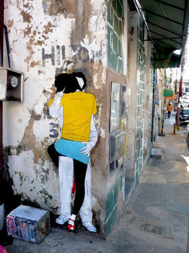 Новогодние праздники со вчерашними салатами и бенгальскими огнями закончились, и совсем скоро нас ждёт самый романтичный день в году: День святого Валентина. Поэтому пришло время отряхнуть разноцветную мишуру, вынести, наконец, ёлку и впустить в свою жизнь любовь и нежность. Проводником в этот мир станет художница Клэр (Clair), которая создаёт на улицах французских городов чувственные силуэты целующихся пар. Если вид двух людей, занятых поцелуем на улице, способен вызвать неоднозначную реакцию прохожих, то при виде влюбленных на картинах художницы даже самые вредные бабушки не скажут гневного «фи». В то время как в Австрии запрещают поцелуи в общественных местах, Клэр в родном городе продолжает превращать теорию о том, что Париж – место любви и чувственности, в аксиому. Атмосфера влюблённости не только витает в воздухе, но и нарисована на стенах. Многие здания мегаполиса украшены изображениями целующихся пар, на которые нельзя не обратить внимание. Прохожий при виде чувственных к