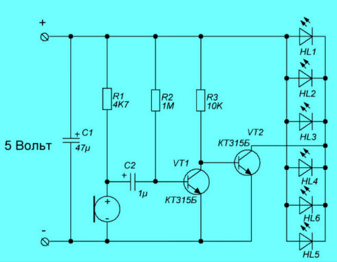 Здравствуйте уважаемые любители самоделок. Сегодня я хотел бы собрать и испытать простую светомузыкальную приставку на двух транзисторах. Собирать мы сегодня будем вот по этой схеме: Немного о радиоэлементах: Транзисторы структуры n-p-n кт315 (я же взял имеющиеся у меня германиевые транзисторы мп35-мп58). Светодиоды обычные разноцветные снятые со старых фонариков. Конденсаторы С1 и С2 электролитические на напряжение 10 вольт. Резисторы у меня млт номиналы на схеме. Микрофон снятый со старого магнитофона. Детали с горем пополам собрал и проверил (поверьте в деревне нет возможности купить радиоэлементы, приходиться разбирать старую технику.) И опять таки как и все собранные мной схемы в качестве основы использовал кусочек фанеры, длиной и шириной 5 на 10 см. Многие задают вопрос в комментариях почему я паяю на фанерке, Еще в детстве все мои конструкции были собраны на фанерках и картонках, для меня это в удовольствии собирать и вспоминать свое радиолюбительское детство. Я понимаю что