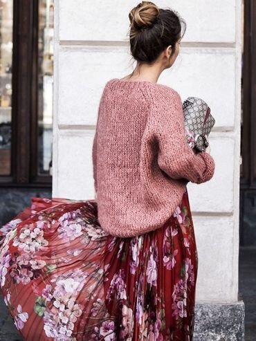Сочетание кофты и легкой юбки до сих пор находится на пике популярности. Прохладные летние вечера как раз то время, когда ноги еще можно «носить» голыми, а на плечи уже хочется что-то накинуть. Несколько идей на тему: Юбка карандаш. Классическая юбка, зауженная к коленям — универсальна и сочетается с огромным количеством вещей. Юбку-карандаш хорошо носить с обьемным, но не очень «толстым» свитером ( скорее мягким). Дуэт смотрится контрастно и привлекательно: низ облегает ноги, подчеркивая изгиб бедер, верх создает баланс, убирая строгую сексапильность низа. Редко кому идет юбка-карандаш с обувью на плоском ходу. Это образ про каблуки. Если oversized свитер не привлекает, можно носить летящую юбку-миди с легким джемпером: красивый, женственный силуэт. Особенно выгодно такое комбо смотрится с юбкой-плиссе: простота «обычной кофточки» и сложность плиссировки. Юбка и спортивный жакет ( бомбер и его вариации ). Вариант хорош тем, что допускает разнообразие обуви - от каблуков, до сникер
