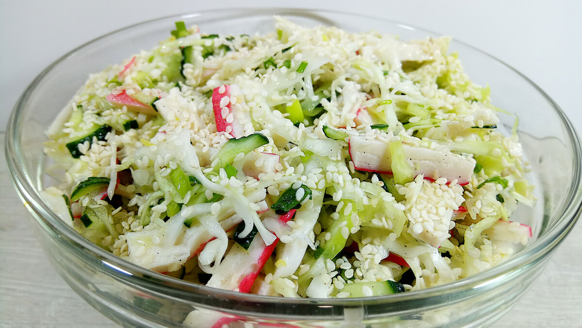 Берем три огурца разрезаем вдоль на тонкие ломтики , нарезаем соломкой и высыпаем в миску. 200 грамм крабовых палочек разрезаем пополам и нарезаем тонкими полосочками, после чего разрезаем на три части и высыпаем в миску. Подпишитесь на мой канал Ольга Лунгу Приготовим заправку.