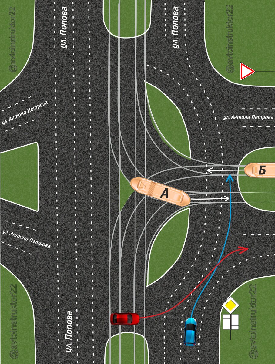 Этот перекресток в нашем городе часто путают с круговым движением, одновременно с этим у многих учащихся автошкол, да и водителей с правами возникают трудности с определением приоритета в движении. В данной ситуации водитель синего автомобиля не должен уступать красному автомобилю и трамваю Б, т.к. находимся на главной дороге по отношению к ним.