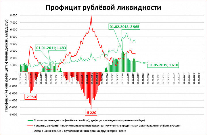 Профицит ликвидности снижается с февраля 2018 года. Хотя до дефицита пока не дошло. На 1 мая профицит ликвидности (здесь: разность между «долгом Центробанка банковской системе» и «долгами банков перед ЦБ») составил 1,6 трлн. рублей. Это значительно ниже пиковых значений на 1 февраля 2018 года (2,97 трлн. руб.). В реальном выражении (в постоянных ценах 2016 года) профицит ликвидности почти в два раза ниже этих пиков. Наблюдения: О чём говорит текущая динамика?