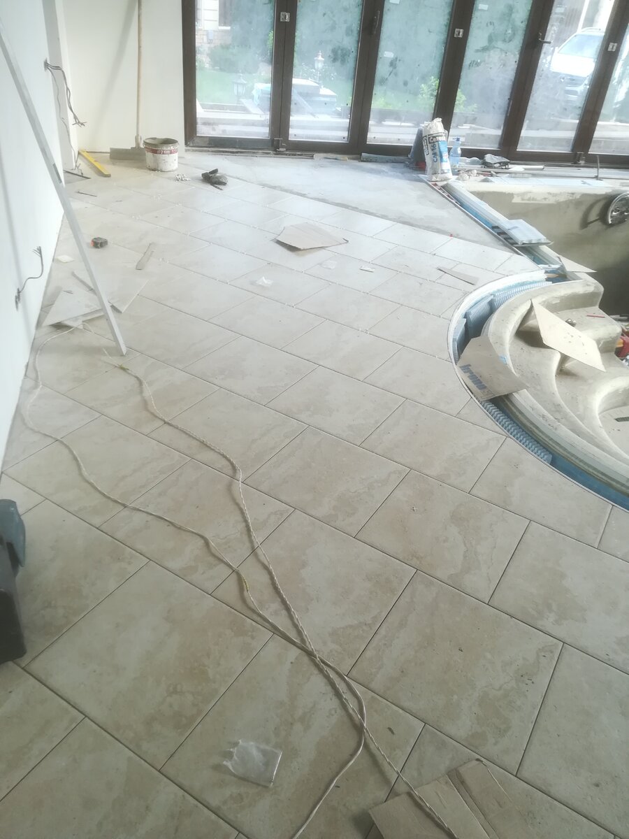 Ещё один способ укладки плитки... Вчера я описал как лучше будет выглядеть укладка плитка под "ламинат". Сегодня хотелось поговорить ещё об одной укладки плитки, но уже совершенно другого формата... Вот так выглядит укладка плитки по диагонали и со смещением на пол плитки. В этой раскладки так же нужно учитывать симметрию всех линий, потому что с сегодняшним качеством плитки это очень важно. Вот так это выглядит в конце работы. Самое сложное конечно было уложить плитку по радиусу. Но как говорится глаза боятся, а руки делают)))