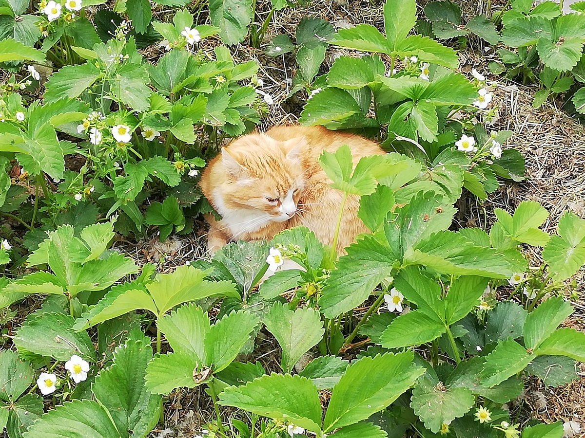 Соседка, конечно, волнуется за клубнику, но котик пока не скомпрометировал себя любовью к плодово-ягодному рациону.