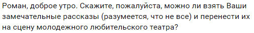 И немного текста о том, как это всё случилось. Однажды утром я получил вот такое сообщение: "Вот это да!" - подумал я. И дал своё согласие - очень интересно было посмотреть, что из этого получится. Из дальнейшей беседы с режиссёром молодёжного любительского театра "Премьера", Юлией Метёлкиной, я узнал, что этот спектакль будет приурочен ко дню рождения коллектива - 29 января. Тяжело вздохнув, ибо смотреть хотелось прямо сейчас и немедленно, я принялся ждать. И вот, 11 января я получаю сообщение с афишей: Я был в неописуемом восторге. А через неделю я получил первые фото с репетиции: 29 числа была премьера спектакля: По словам режиссёра, людям спектакль понравился, свои слова Юлия подкрепила фотографиями отзывов. Они, конечно, не для меня, но отзывом от Царя не поделиться просто нельзя: Через некоторое время мне прислали на память афишу и программку с автографами всех актёров, диск с видеозаписью спектакля и номер местной газеты, в которой была небольшая статья о прошедшей премьере