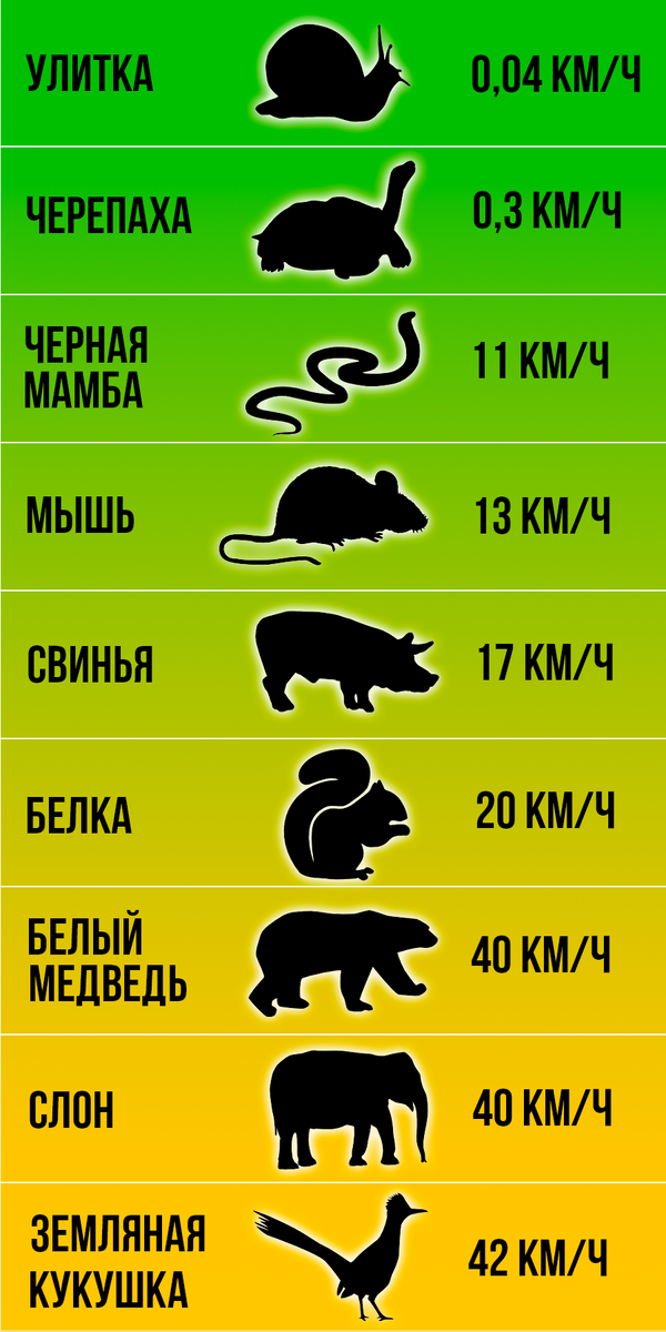 Все мы знаем, что человек не наделен какими - либо выдающимися физическими данными в сравнении с другими представителями животного мира. И если отбросить в сторону наш интеллект, то что же мы смогли бы противопоставить диким зверям. Для сравнения решил выбрать такой параметр как скорость, и чтобы совсем не было грустно, возьмем скорость самого быстрого человека на нашей планете. Мировой рекорд принадлежит олимпийскому чемпиону Усэйну Болту, его максимальная скорость, которая была зафиксирована, равна 44,7 км/ч. Это довольно впечатляющая цифра, но будет ли она таковой при сравнении с другими представителями животного мира. Итак, давайте выясним, от каких зверей сможет убежать наш чемпион, а каким он все же пойдет на закуску. От кого убежит человек: Кто догонит и съест чемпиона: Естественно, что в диких условиях, многие из этих зверей догонят и перегонят человека, тем более, если он не Усэйн Болт. Но если бы они бежали стометровку на стадионе, то результат, показанный выше, имеет место