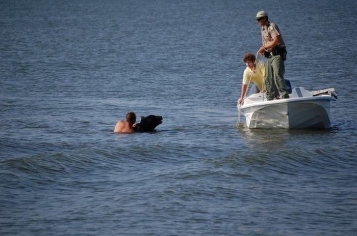 Мы очень часто видим по новостям о том, как какой-то человек спас иного человека. Но также мы видим и такие ленты, где человек не боясь за свою жизнь, спасает животного. На самом деле, если углубится в этот вопрос, то подобных ситуаций очень много в мире. Давайте рассмотрим подборку самых смелых действий, которые помогли спасти жизнь животным. Можем заодно убедиться в том, что в этих людей-спасателей точно великая душа, доброта, сопереживание и сострадание. Спасение медведя Все знают, что во Флориде можно часто встретить медведя, который слоняется просто по улицам. Такой гость в этом месте может заглянуть случайно и в окошко дома. В этой истории также медведь заглянул в домик, что стоял на берегу океана. Его хозяин не стал впадать в панику, а вызвал полицию на помощь. Полицейские прогоняли медведя, но он не уходил. Тогда у него было выстреляно транквилизатором. Это сделали для того, чтобы медведь уснул, и его можно было перевезти в лес. Когда дротик попал у медведя, то он от испуга