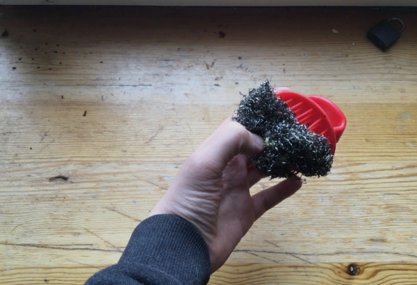 Металлическая губка незаменима при мытье сковородок или застарелого жира. Однако ее использование ограничивается не только мытьем посуды, но и различными применениями в быту. Сеточка на слив, возможно у вас нет ее в доме. Но что бы раковина не засорялась можно временно воспользоваться кусочком губки. Она не будет пропускать загрязнения, однако вода может спокойно проходить. Удаление ржавчины, можно это сделать при помощи раствора лимонной кислоты 1 столовая ложка порошка на стакан воды. И так же воспользоваться металлической мочалкой, она довольно быстро и хорошо удаляет ржавчину. Чистить бутылки и банки изнутри. Довольно часто перед нами встает задача как очистить бутылку изнутри, рукой туда не залезешь. Можно взять кусок губки и отрезать его, после чего затолкать ее в горлышко и прополоскать с водой. Потом ее можно легко удалить пинцетом или щипцами. Очистка подошвы. Покупая обувь в магазине онак очень красивая и прекрасно выглядит. Однако после долгого использования подошва становит