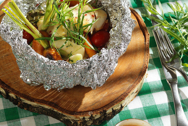 ИНГРЕДИЕНТЫ Филе палтуса 300 г Молодая морковь 4 штуки Лук-порей 2 стебля Чеснок 2 зубчика Лук-шалот 2 головки Помидоры черри 10 штук Белое сухое вино 60 мл Оливковое масло 2 столовые ложки Эстрагон 2 стебля Лавровый лист 2 штуки Розовый перец по вкусу Перец черный молотый по вкусу Соль по вкусу ИНСТРУКЦИЯ ПРИГОТОВЛЕНИЯ