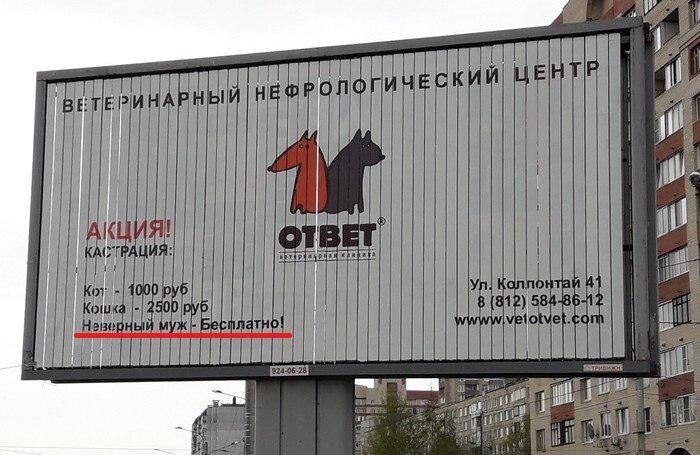 Одна из питерских ветеринарных клиник решила купить несколько рекламных мест, на которых разместили свою акцию, с шуткой о бесплатной кастрации неверных мужей.