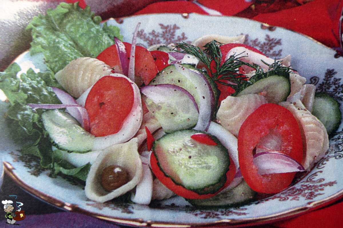 Макароны (ракушки) - 200г; Кальмары - 150г; Огурец (свежий) – 2шт; Лук репчатый – 1шт; Майонез; Салатные листья; Сливочное масло; Соль – на ваш вкус. 📝 Ракушки отварите в слабосоленой воде, затем слейте воду, добавьте кусочек сливочного масла, хорошо перемешайте. 📝 Отварите морепродукты, не больше 4 минут. Остудите и нарежьте мелкими кусочками, затем засыпьте в макароны и перемешайте. 📝 Два огурца, луковицу и листья салата нашинкуйте и добавьте в макароны. Салат готов, заправьте майонезом и хорошо перемешайте.