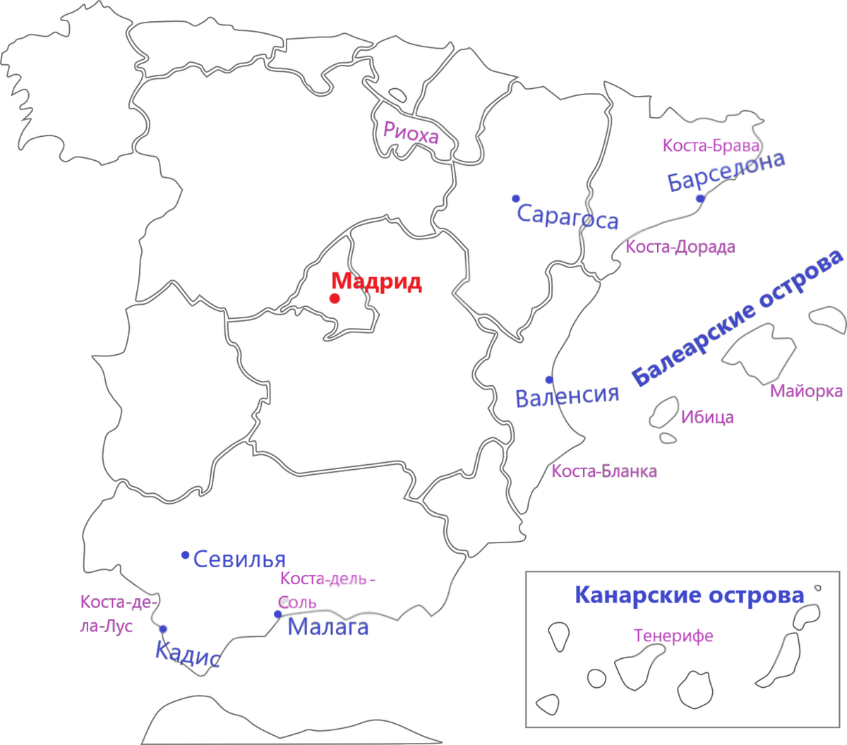 Привет! =) В статье разберем погоду в разных частях Королевства Испания и отметим когда и куда с учетом этого лучше ехать в зависимости от времени года. Чтобы приведённая карта не вводила Вас в заблуждение, хотелось бы заметить, что Канарские острова территориально находятся не рядом с Испанией, а немного западнее южной части Марокко, то есть вполне себе в Африке. На карте они показаны схематично, как принадлежащие Испании. Итак, когда же ехать в Испанию? Ответ на этот вопрос зависит от цели такой поездки. Пляжный отдых, несомненно, должен быть запланирован на период с мая по сентябрь. Культурную программу можно с легкостью продлить до поздней осени - в большей части страны температура в это время все еще держится в комфортном диапазоне (+15-20°C). Зимой туристы посещают Испанию ради горнолыжных курортов, большая часть которых расположена на Пиренеях и в Иберийских горах. Разберем погоду в Испании по месяцам. В январе и феврале в большей части Испании температура держится в районе +10°