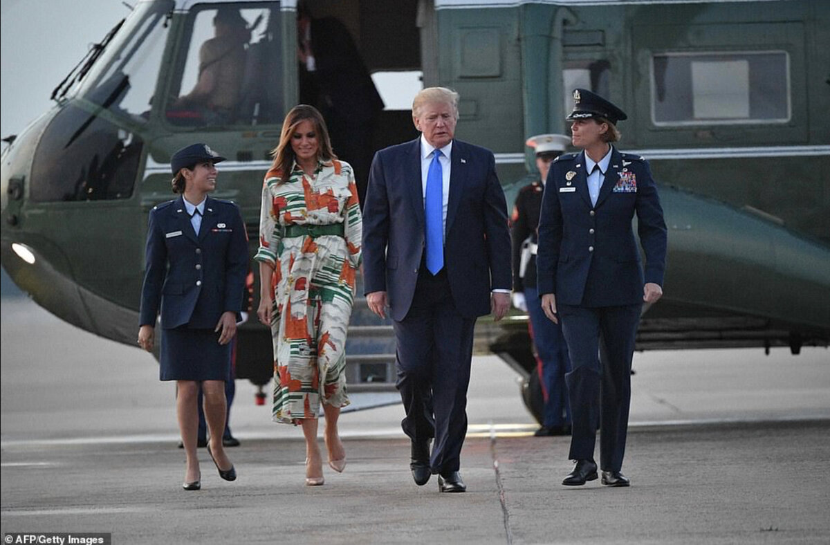 На Меланье при погрузке было замечено платье Gucci с изображением британских достопримечательностей - видимо, хочет сделать приятное гражданам страны-союзника.
