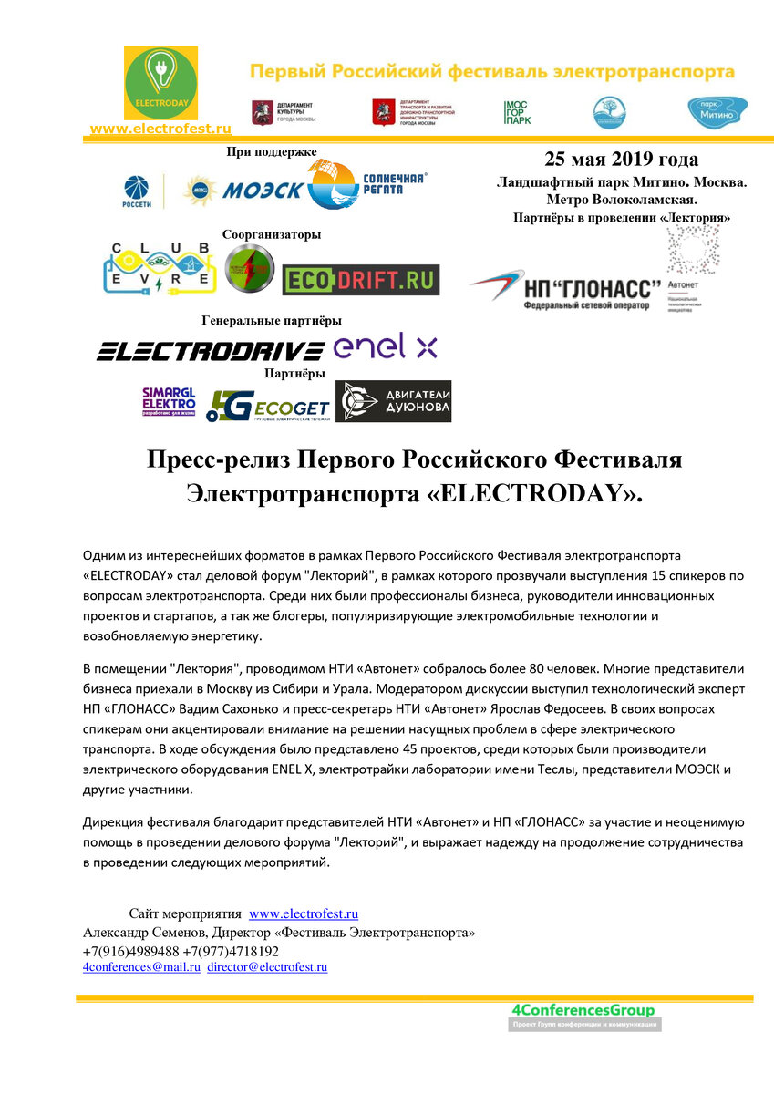 Пресс-релиз Первого Российского Фестиваля Электротранспорта «ELECTRODAY» по проведению делового форума "Лекторий".