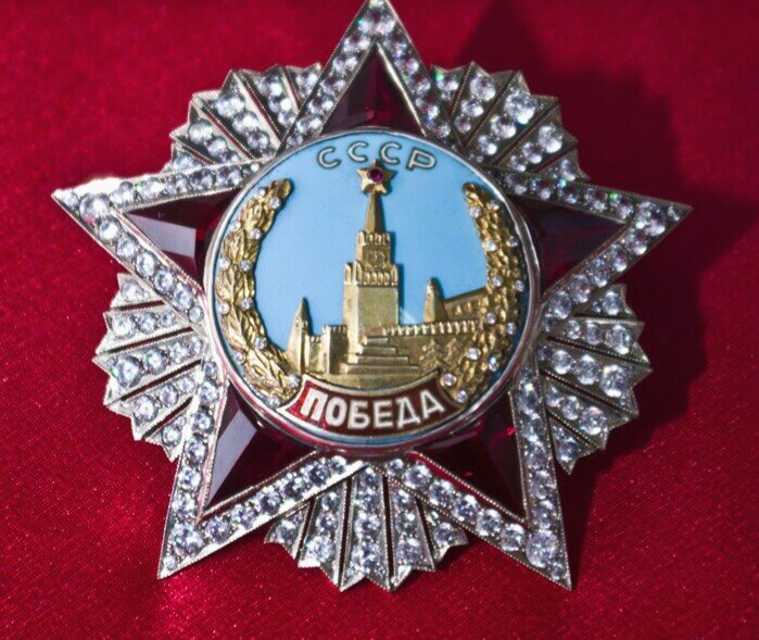 В Советском Союзе было большое количество различных военных наград: орденов и медалей, которые вручались за те или иные заслуги перед Родиной. После коренного перелома в ходе Великой Отечественной войны возникла идея создать высшую военную награду, чтобы награждать особо отличившихся военачальников. Новую награду было решено назвать орден “Победа”. Новый орден оказался очень дорогим в производстве. Весил он 78 грамм и состоял из 47 грамм платины, 2 грамм золота, 19 грамм серебра, 25 карат рубинов и 16 карат бриллиантов. Награда представляла собой пятиконечную звезду с изображением Кремля в середине. Орден выглядел красиво и почётно, подчёркивая заслуги своего обладателя. Всего было выпущено 20 таких орденов. Первым высшую награду получил Маршал Советского Союза Г.К.Жуков в 1944 году. Всего орденом была награждено 17 человек, трое из которых слали кавалерами ордена "Победа” получив его дважды. Кавалерами ордена "Победа” стали Жуков, Василевский и Сталин. Также этим орденом было на