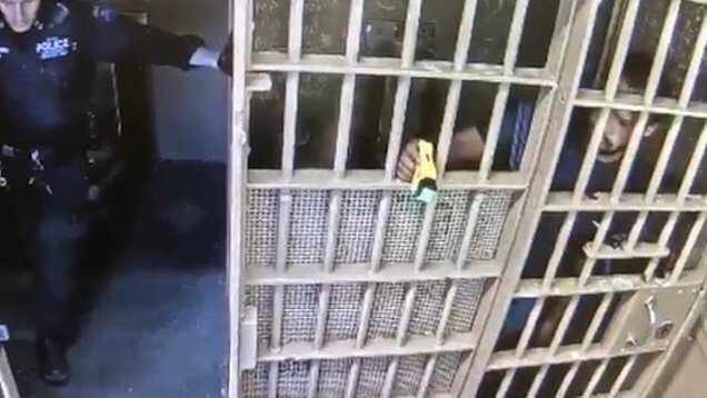 Эндрю Лоуренс, 22 года, находился в камере содержания в полицейском участке Стейтен-Айленда, когда он протянул руку через решетку, схватил электрошокер из жилета полицейского и угрожал им двумя офицерами. В тревожном ролике видно, что два офицера бегут в соседнюю камеру в целях безопасности. Заместитель инспектора Иса Аббасси вмешался и убедил Лоуренса бросить тазер. Лоуренс был обвинен в безрассудной угрозе и угрозе полиции, согласно судебным протоколам. Судья также назначил ему психиатрическую экспертизу.