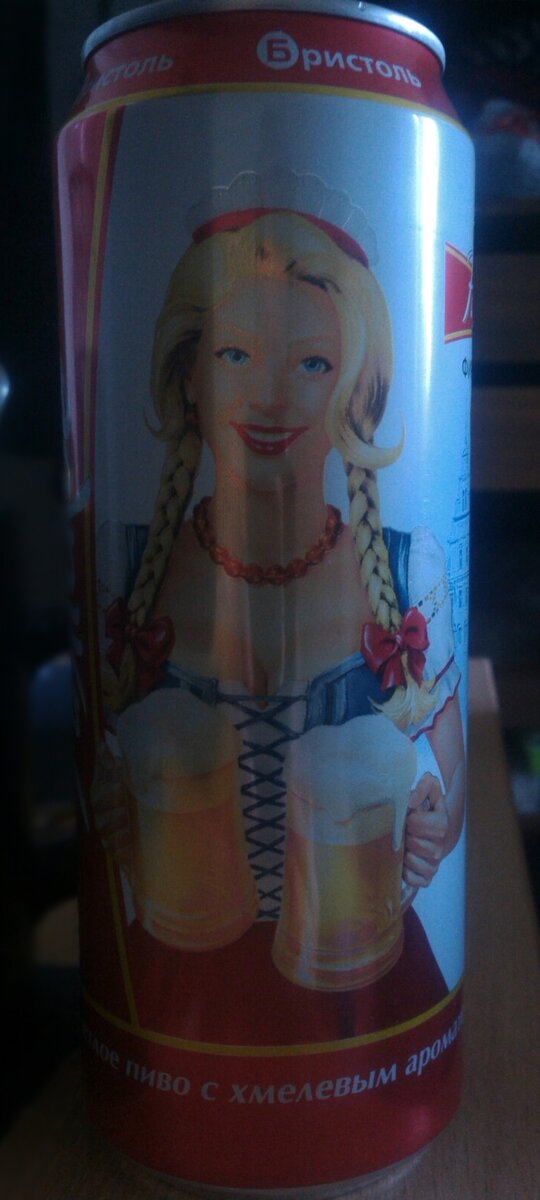 Снова "рижское", снова бюджетное, снова фирменное. Изготавливается по заказу сети. 34,5 рубля за "нечестные" пол литра, по акции. Пивная тара выполнена в цветовой палитре сети "Бристоль". Дизайн банки ничем особым не примечателен, кроме крупного изображения официантки в традиционной (баварской) форме с выдающимися "достоинствами", ровно которые подчёркивает платье. Об эксклюзивности напитка также свидетельствует синяя печать на лицевой стороне. Шрифт информации для потребителя малочитабелен. С открытия тары, "рижское" встречает самым обычным, стандартным, средней насыщенности хмелевым ароматом. Весьма простенько. На языке и в послевкусии хмель ощущается чуть приятнее - горечь умеренная, лёгкая. То же касается и солодовой базы - до боли обычная. Ещё в данной марке пива хочется отметить кислинку, ни мерзкой, ни приятной я бы её не назвал. При всём при этом продукт питкий, спиртуозности ни в процессе, ни в послевкусии нет. Цвет - бледно-соломенный. А пена, пусть не сильно нежная, стойче