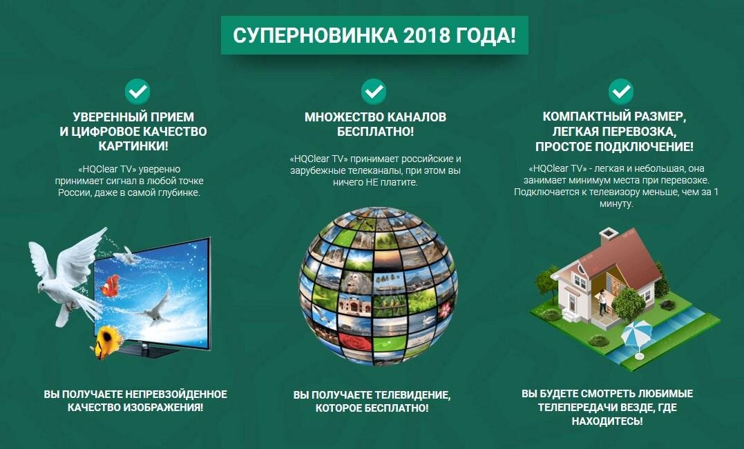 Спрос рождает предложение. В интернете моментально стали выходить множество статей технического, ругательного и некультурного содержания, в которых озвучивался вопрос. Какую антенну подобрать, чтобы не остаться без любимого телевизора. Вот тут и появляется hqclear tv , который предлагает идеальное решение Вашей проблемы, за минимальные деньги с оперативной доставкой в любую точку России. Если сравнивать предлагаемые модели на рынке, то естественно hqclear смотрелся выигрышно по сравнению с конкурентами.