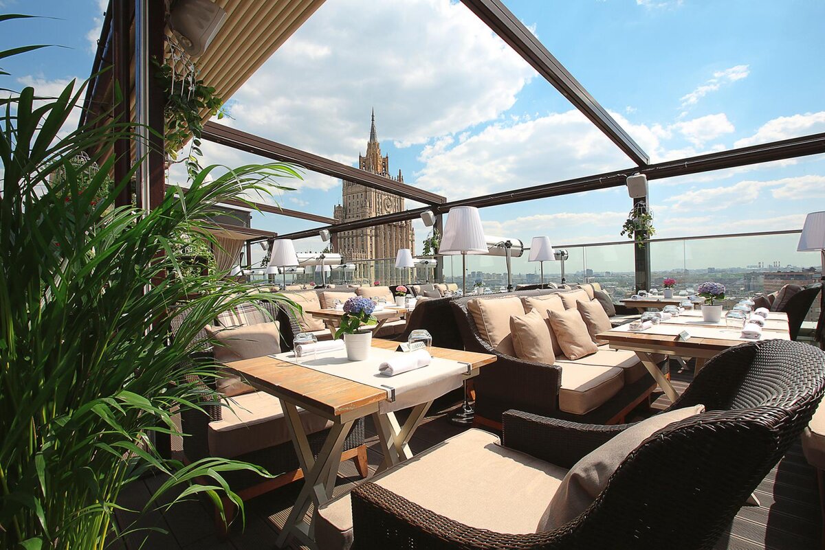 Хочется увидеть Москву с ещё большей высоты? Тогда вам на 16 этаж Смоленского пассажа, где под стеклянным куполом расположился ресторан русской кухни White Rabbit. Летняя веранда этого заведения всегда по душе московским гурманам. Вдоль террасы разместились столы с плетёными диванами и светлыми подушками, панорамные окна украшают подвесные корзины с цветами, стеклянная раздвижная крыша в пасмурную погоду защитит от ветра и дождя, а в зной спрячет гостей от яркого солнца.