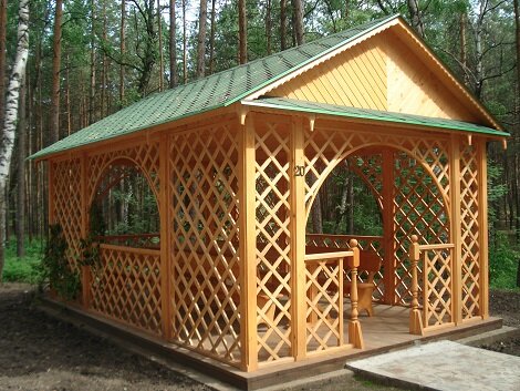 Беседка – это очень приятное и удобное место на дачи, где можно отдохнуть. Беседка должна быть яркой и внушать только позитивное настроение. Для беседки нужно подобрать идеальное место, где всегда будет тень. В жаркую погоду и тени бывает не хватает, так что в месте, где будет беседка должно быть и прохладно. Так что оптимальным местом для беседки является место возле густых деревьев. В такой беседки в жаркую погоду будет всегда тень, и вдобавок от деревьев будет идти приятная прохлада. Для строительства беседки понадобится: Технология строения беседки. Первым делом нужно установить четыре бруса. Для этого нужно выкопать четыре ямы и вставить в них брус. Брусья лучше всего зафиксировать бетоном. Он крепко зафиксирует брус и защитит его от лишней влаги. Расстоянием между ямами можно изменять размеры беседки. Когда брус будет зафиксирован, его нужно обработать спиртовой морилкой, чтобы увеличить время гниения древесины. По возможности можно этим же способом обезопасить всю древесину в б