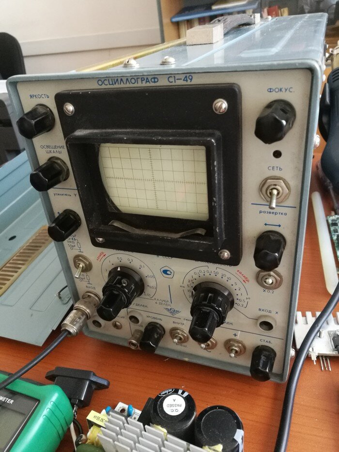 Знакомый принёс осциллограф С1-49, не работает. Возможно не работал никогда, достался по наследству. При включении горизонтальная развертка есть вертикальной нет. Долго искал схему, после чего провел замеры по контрольным точкам. На одной из точек напряжение сильно занижено, оказалось короткое замыкание. Поиск места кз привел на плату. Лампа не светится. Короткое замыкание на 4 ноге, откинул все что подключено к дороже, короткое остаётся. Причина замыкание внутри текстолита. Подключил всё навесом. Всё работает. Собрал, закрыл, ушел домой. Утром включаю что за … нет горизонтальной. Опять замеры по точкам, отвалился провод. Теперь уже всё точно работает. Здоровья и успехов дорогой читатель! Подписывайтесь на канал будет интересно!