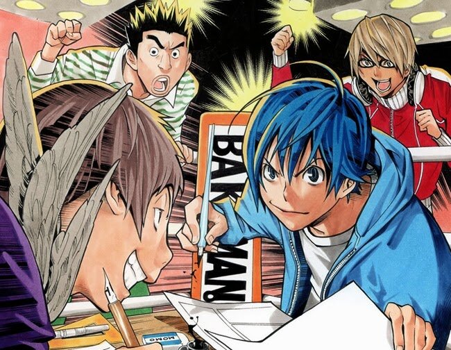 Манга о манге Достигнув громкого успеха благодаря «Тетради», дуэт Обата Такэси и Оба Цугуми не распался, а продолжил деятельность над мангой совершенного иного рода – «Bakuman», историей двух школьников (Масиро Моритака и Такаги Акито), мечтающих войти в манга-индустрию. Произведение создавалось с 2008 г. под руководством уже другого редактора «Jump» — Айды Соити. Комикс удостоился внимания и любви читателей (продано около 15 млн копий), что также привело к появлению одноименного аниме и фильма. Идея «манги в манге» Идея «манги в манге» у Обы возникла, когда писатель узнал, что многие школьники мечтают работать мангаками. Он задумался, а что именно можно рассказать об этом «бизнесе», с чем приходится сталкиваться тем, кому удается пробиться в мир комиксов. Эти мысли воплотились в жизненную комедию, раскрывающую изнанку работы мангаки. Как отмечал Обата Такэси в одном из интервью, резкий переход сценариста от мрачности «Тетради смерти» к комедийному жанру вызвал у него немалое удивлени