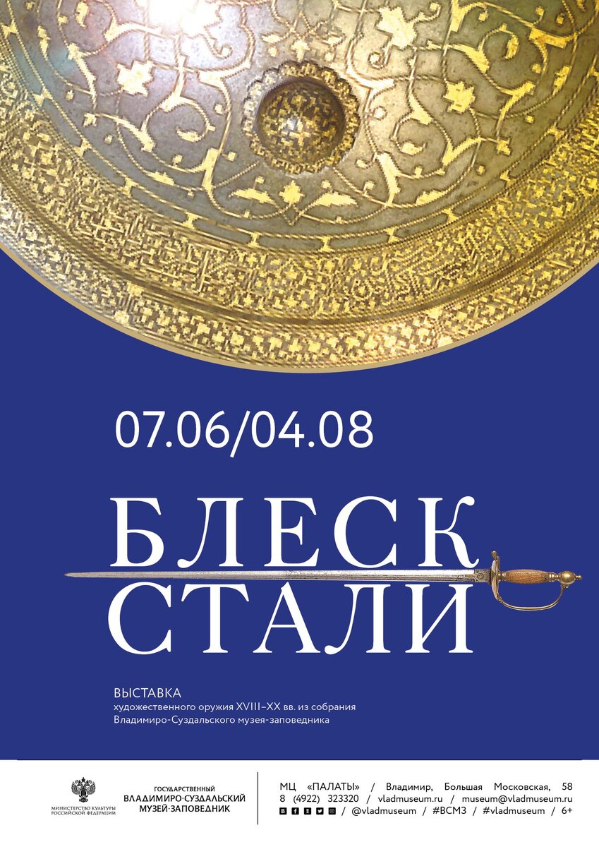 Звонкие камзольные шпаги и острые драгунские шашки, парные дуэльные пистолеты, каретный мушкетон и «сибирская винтовка», «злой дух» – булава и изысканный шамшир… На протяжении тысячелетий оружие для человека было не только средством защиты от врагов, но символом свободы и независимости владельца, предметом гордости. Впервые в едином музейном пространстве будут собраны 40 сверкающих сталью экспонатов, рассказывающих об истории русского и иноземного оружия XVIII – начала XX вв. Их достоинства свидетельствуют о таланте и мастерстве оружейников прошлого. Лучшую часть коллекции оружия ВСМЗ составляют раритеты, переданные в музей в 1920-е годы из дворянских усадеб В.С. Храповицкого, Трегубовых, Воронцовых-Дашковых, а также из Владимирской Губернской Чрезвычайной комиссии. В двух залах владимирских «Палат» представлено боевое, охотничье и парадное оружие и вооружение XVIII – начала XX вв. из Англии, Германии, Испании, Франции, России и стран Востока. В первом зале собраны разные виды оружия и
