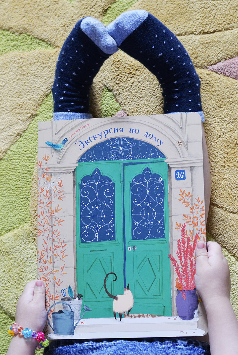 Моя дочка их просто обожает! Первые такие книжки появились у нас очень давно. Но дочка была совсем маленькая и открывать окошки у нее получалось плохо – она часто просто их вырывала. И я эти книги убрала. Сейчас дочке чуть больше 3-ех и с окошками в книгах она прекрасно справляется. А еще они ей очень нравятся. Последние дни «любимой» книгой стала «Экскурсия по дому» Камиллы Гарош издательства «Поляндрия». Главный герой – сиамский кот предлагает 3-ем щенкам-непоседам прогуляться по дома, и дать отдохнуть своей маме. (Этим ом мне сразу понравился). Щенки рассматривают коридор, гостиную с большой библиотекой, современную кухню, столовую с камином, спальню с контрабасом и подзорной трубой, детскую комнату с красным сундуком и игрушечным замком, огромную ванну с ширмой и таинственный чердак. И везде экскурсию ждут сюрпризы. Шкафчики и полочки открываются, книги и картины хранят секреты, часы прячут удивительные механизмы. Можно заглянуть в портфель хозяина дома, внутрь детского замка, в с