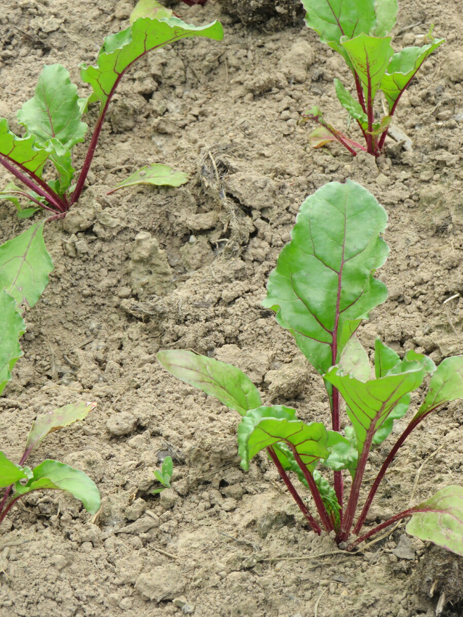 Смотрю я на эти фотографии сейчас и думаю - боже, ну и земля у нас.... И это еще очень и очень хорошо окультуренная , в грядках, куда несколько лет подряд вносили и торф, и перегной, и солому резаную и черта в ступе. Глина все равно остается пока глиной - тяжелая, рыжая, бетонируется после любого дождя... Впрочем, именно свекла к глине относится очень хорошо. Урожаи этого корнеплода у нас всегда отменные, это вам не арбузы... И не репка, которая у нас как раз растет из рук вон плохо - ей у нас не нравится примерно все- и земля в первую очередь. Свеклу я выращиваю двумя способами. Четверть большой гряды отвожу под свеклу рассадную. В теплице в марте высеваем густо пару полосок, в конце апреля осторожно извлекаем оттуда самые толстые и веселые ростки с самыми неповрежденными корнями - и рассаживаем в открытый грунт. Раньше я высаживала еще и лишние ростки, вынутые из гряд при прореживании свеклы посевной, но сейчас я так не делаю, так как ростки эти развиваются плохо, долго болеют,
