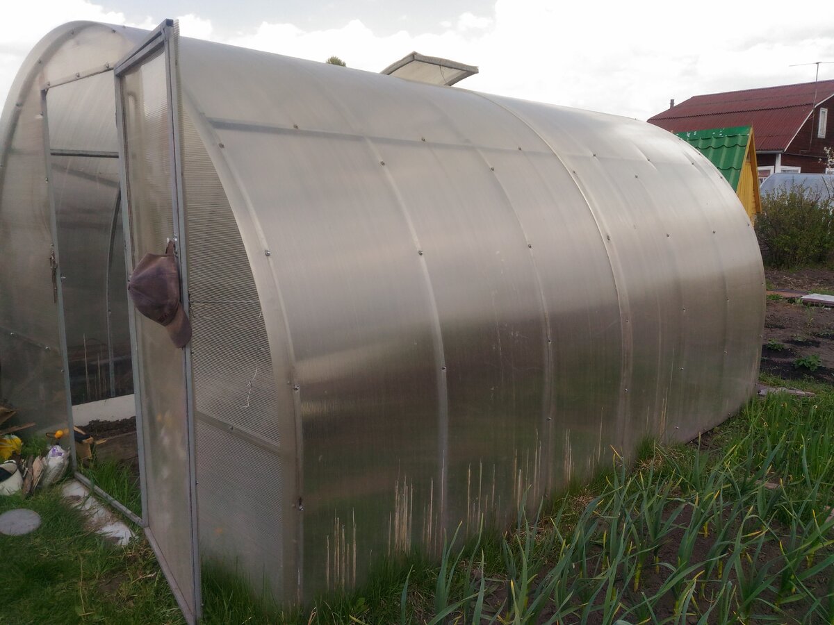 Моя теплица с усиленными дугами, поэтому даже в заснеженные зимы выдерживает на себе толстый слой снега. При осмотре снаружи нужно отчистить прошлогодний мох и мусор, а внутри убрать все старые растяжки и шнуры для подвязки огурцов и томатов. Теперь поликарбонат можно пролить чистой водой из шланга. Каждую осень мы перед закрытием дачного сезона дезинфицируем теплицу с помощью серной шашки.