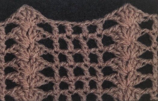 Количество возд. п. начальной цепочки кратно 14 + 8 возд. п. для симметрии + 3 возд. п. для подъема. 1-й ряд: в 7-ю возд. п. от крючка провяжите 1 ст. с/н, * (1 возд. п., пропустите 1 возд. п. нач. цепочки, 1 ст. с/н в следующую возд. п. нач. цепочки) 2 раза, 1 возд. п., пропустите 3 возд. п. нач. цепочки, провяжите в следующую возд. п. нач. цепочки (3 ст. с/н, 2 возд. п., 3 ст. с/н), пропустите 3 возд. п. нач. цепочки, 1 возд. п., 1 ст. с/н в следующую возд. п. нач. цепочки, 1 возд. п., пропустите 1 возд. п. нач. цепочки, 1 ст. с/н в следующую возд. п. нач. цепочки, * (1 возд. п., пропустите 1 возд. п. нач. цепочки, 1 ст. с/н в следующую возд. п. нач. цепочки) 2 раза; 2-й ряд: 3 возд. п. для подъема, 1 возд. п., пропустите 1 возд. п. предыд. ряда, 1 ст. с/н в следующий ст. с/н предыд. ряда, 1 возд. п., пропустите 1 возд. п. предыд. ряда, * (1 ст. с/н в следующий ст. с/н предыд. ряда, 1 возд. п., пропустите 1 возд. п. предыд. ряда) 2 раза, провяжите за следующую арку из 2