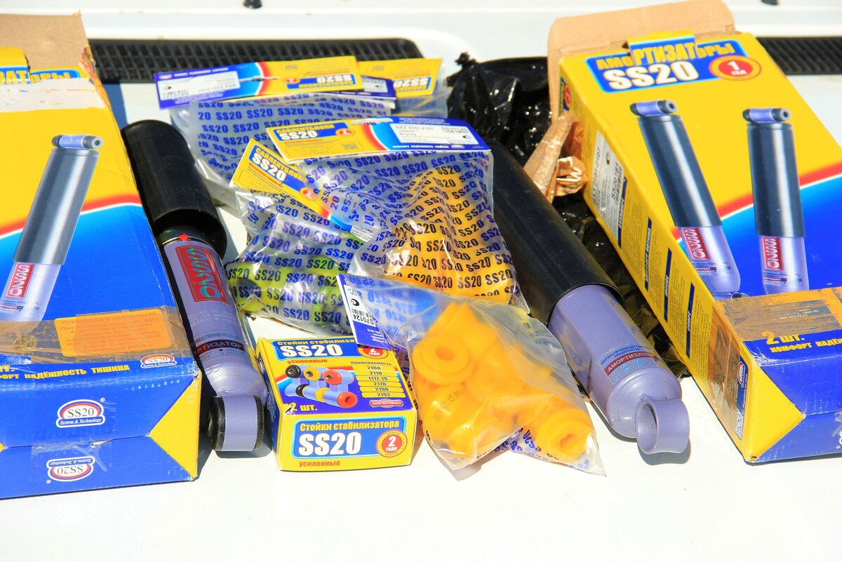 Но этой весной я снова обзавёлся на короткое время Жигой для перевозки различного скарба. И решил попробовать полный комплект подвески (полиуретановые сайлентблоки, крепления стабилизатора, амортизаторы), кроме пружин, от фирмы SS 20. Плюсом, переделав убогое крепление стабилизатора к рычагу, выкинув скобки, и установив стойки стабилизатора от 8-ки.