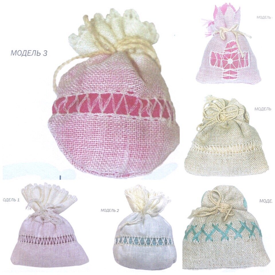 Шесть маленьких льняных мешочков выполнены по одной выкройке, но с разными узорами. Мешочки-саше можно наполнить различными сухими ароматными травами и держать в шкафу около белья, а также можно использовать их для хранения различных мелочей: колечка, маленького сувенира и т.п. Размер 6 х 8 см Материалы: Технология изготовления Выкройки Модель 1 А- 11 см. Г- 2 см. Ж- 1 см. поз. 1 — мережка «в раскол» (5-3). Б — 13 см. Д — 0,5 см. 3 — 6 см. поз. 2 — мережка «икс» (вариант 5-5.1 и 5-5.3). В — 5 см. Е — 4,5 см. И — 13 см. поз. 3 — линии прохода тесемок. Модель 2 А- 1 1 см. Г- 2 см. Ж- 1 см. поз. 1 — мережка «икс» (вариант 5-5.1). Б — 13 см. Д — 0,7 см. 3 — 6 см. поз. 2 — мережка «икс» (вариант 5-5.1 и 5-5.3). В — 5 см. Е — 4,5 см. И — 13 см. поз. 3 — линии прохода тесемок. Модель 3 А- 1 1 см. Г- 2 см. Ж- 1 см. поз. 1 — мережка «в раскол» (5-3). Б — 13 см. Д — 0,7 см. З — 6 см. поз. 2 — мережка «икс» (вариант 5-5.1 и 5-5.3). В — 5 см. Е — 4,5 см. И — 13 см. поз. 3 — линии прохода