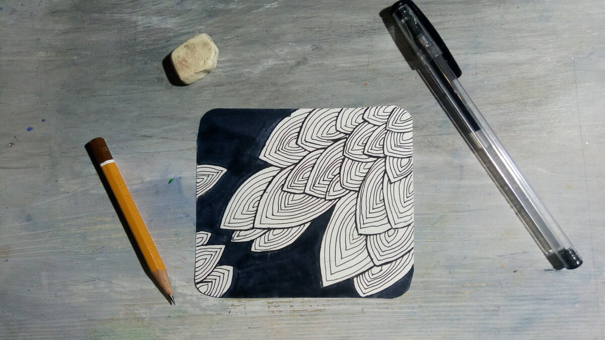 Всем привет! Продолжаем наши дзен-посиделки. Прошлые можно найти по этим ссылкам: Там же можно почитать, что такое зенарт и чем он полезен. Сегодня освоим ещё один простейший способ создать узор, не задумываясь и не терзаясь творческими муками. Узор чем-то напоминает чешую, собственно, отсюда и название. Начнем. Не можете читать сейчас? Подписывайтесь на инфоканал автора. Анонсы статей и творческая информация, которую я не даю на Дзен канале (распродажи в творческих школах, интересные марафоны, закрытые уроки от автора канала и др.), жмите и переходите по нужной ссылке: Карта канала (здесь все актуальные ссылки на ресурсы автора) Если не можете выполнят урок сейчас, сохраняйте его в закладках или соцсетях. Берем небольшой лист, карандаш и вперед. Расчерчиваю лист из угла линиями, такими лучиками солнца. На листе они у нас не пересекаются. Выбираю любую фигуру. Сегодня у меня это лепесток, Вы выбираете любую. Начинаем заполнять лист фигурами вдоль выбранной линии. Нарисовали фигуру того