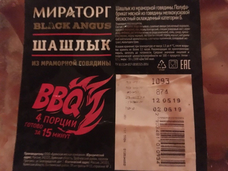 Недавно ездили в большой супермаркет, чтобы прикупить необходимые продукты, но, как обычно, в корзине оказалось и то, что изначально не планировалось к покупке. Радует, что хотя бы продукты из мясного отдела, а не какие-либо бесполезные "хотелки". К марке "Мираторг" я отношусь нейтрально - чаще всего мне нравятся их продукты, но цену я считаю завышенной, поэтому покупать стараюсь по акции. Сейчас, кстати, довольно часто встречаю у них эту "мраморную говядину" и надписи "black angus", которые преподносятся как что-то очень хорошее и качественное. В общем, оказался у меня в корзине шашлык из говядины, замаринованный в соусе "барбекю". На упаковке указано, что килограмм мяса, который я купила - это четыре порции, а время их приготовления каких-то 15 минут. Правда стоит учитывать, что 15 минут - это если готовить шашлык так, как он и должен быть приготовлен. У меня такой возможности не было, поэтому весь процесс приготовления происходил дома с помощью грильницы. Стоимость килограмма такого