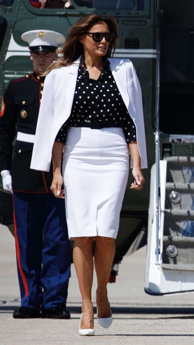 Стиль Мелании Трамп отличается элегантностью, уместностью ситуации и абсолютно прост в исполнении. Безусловно она обладательница роскошной фигуры и все ее наряды стоят баснословных денег, однако в них нет ничего такого, что бы нельзя было повторить. Горох Всеми любимый принт "горох", который не выходит из моды уже многие десятилетия, остается трендом и этого сезона. Мелания Трамп запросто использует горох в своих аутфитах, не изменяя при этом своим традициям в крое платьев. Вертикальная полоска Еще один горячий тренд лета 2019 года - вертикальная полоска, при чем абсолютно любой ширины и цвета. Мелания также берет принт на вооружение. Образы получаются неординарными и стильными. Цветочный принт Мелания - большая любительница цветочных принтов. Связано это больше не с ее предпочтениями, а с многообразием рисунков с точки зрения ее стилиста. Чаще всего Мелания отдает предпочтение мелкомасштабным цветам или скромным россыпям изящных бутонов. Платье-халат Этим летом одной из любимых мо