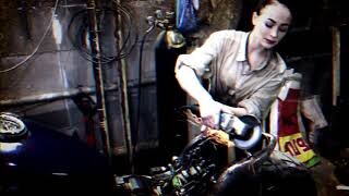 Красивая девушка работает болгаркой в мастерской Леший Custom