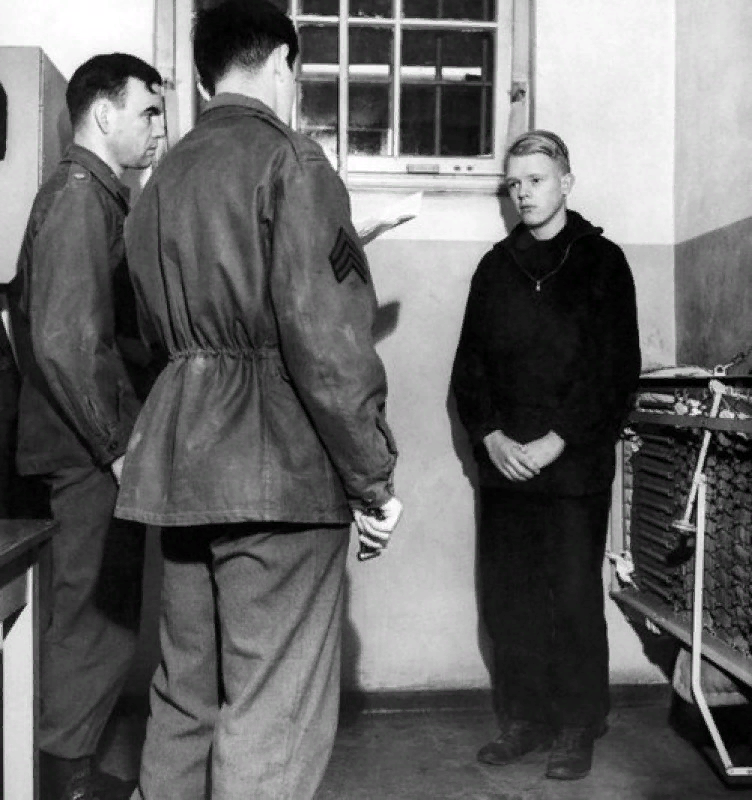 16-летний лидер Гитлерюгенда в г. Моншау Карл Арно Пунцеллер (справа), слушает, как сержант армии США Э.Хартманн (центр) оглашает и переводит ему приговор - пожизненное заключение в тюрьме. Карл Арно Пунцелер (Karl Arno Pünzeler) осужден как шпион.