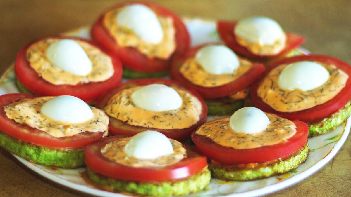 Когда хочешь похвалиться, в народе говорят: - "Каждый кулик свое болото хвалит." Я совсем не похожа на кулика и никогда не жила на болоте. Но похвалюсь этой закуской, классикой всех времен и народов. Ее делали мамы, бабушки, соседи, друзья и враги - все, кто не равнодушен к кабачкам и помидорам. Мне кажется таких людей очень мало. ИНГРЕДИЕНТЫ молодой кабачок, помидоры, чеснок, майонез, зелень, вареные яйца (по желанию). Рецепт простой закуски из кабачков В качестве соуса я буду использовать домашний майонез с добавлением помидора и аджики, поэтому пусть вас не пугает его розовый цвет. Можно использовать обычный майонез или смесь майонеза и сметаны. СОУС Мелко нарезать зелень и чеснок, можете выдавить чеснок через чеснокодавилку. Перемешать всю зелень и чеснок с майонезом. КАБАЧКИ Нарезать кабачок пластинками примерно сантиметр толщиной. Если кабачок молодой чистить его не нужно. Немного посолить, поперчить и все перемешать. ОБЖАРКА На сковороде разогреть немного растительного масла. О