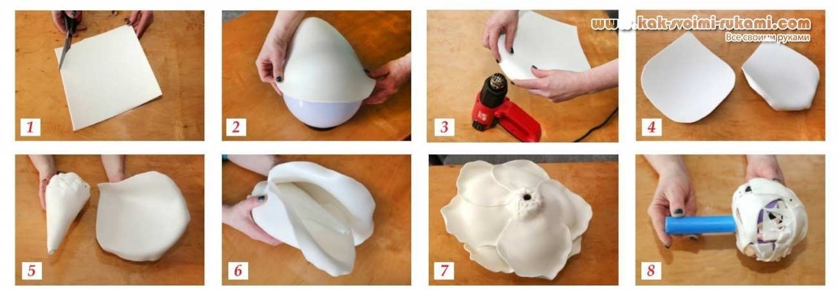 Из изоляционного листа вырезали 22 квадрата 25 × 25 см. Разрежьте на каждом из трех углов, образуя лепесток (фото 1). Средняя часть нагревается над феном и натягивается на пластиковый шарик от лампы (можно использовать маленький шарик) (фото 2). Затем круглый край лепестка нагревают и сгибают руками (фото 3). Лепесток готов (фото 4)
