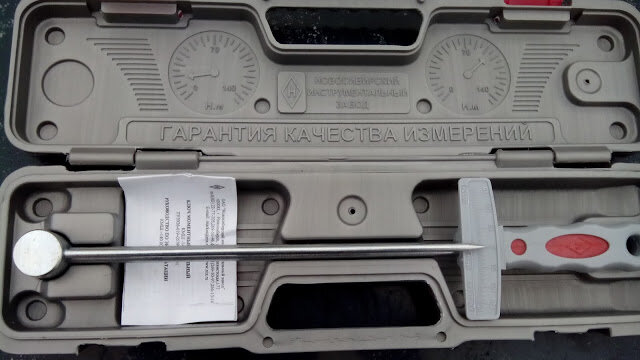 Сегодня рассмотрим бюджетный вариант динамометрического ключа от Новосибирского инструментального завода КМШ-140. Ключ упакован в пластиковый кейс, пластик жесткий, ударостойкий, такой же как и из шоферского набора. В набор входит ключ и инструкция к нему. Стрелка показывает на ноль, как и должно быть. Ключ прямой, в руке лежит хорошо, ничего не болтается, выполнен на вид качественно, металлическая часть с антикоррозийным покрытием, нареканий нет. На обратной стороне ручки выбит цифровой код. В руководстве приведены основные технические характеристики изделия и как им правильно пользоваться, имеется полный адрес и контакты производителя. Диапазон измерений указан от 30-140 Н.м или 3-14 кгс*м, хотя фактически шкала позволяет измерять от 0,5-16 кгс*м. Погрешность ±4%, что для затяжки отечественной "классики" вполне допустимо, квадрат 1/2 дюйма — самый распространенный среди шоферского инструмента. В самом конце стоит штамп и подпись Отдела технического контроля, что говорит о том, что кл