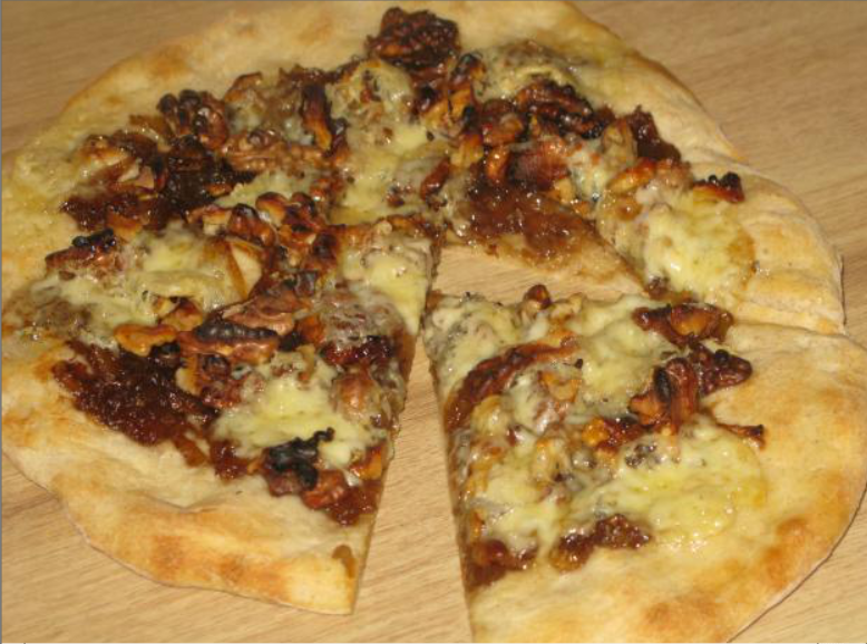 Пицца с луковым мармеладом, грецкими орехами и голубым сыром