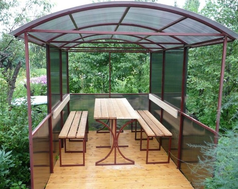 При возведении на даче беседки каждому хочется сделать ее максимально комфортной в использовании. Один из популярных материалов для каркаса – профильная металлическая труба. Она практичная, дает возможность сделать постройку любой разумной формы с небольшим весом и высокой устойчивостью. Подготовительные работы Чертежи доступны в интернете, поэтому главной задачей можно считать выбор трубы с оптимальными параметрами длины, ширины и толщины стенок. Готовое строение должно быть прочное, но переплачивать тоже нет смысла. Рекомендуемые значения (сечение и толщина стенок): Беседка из профиля может быть любых размеров, длина отрезков труб определяется после разработки чертежей. Этот материал не самый дешевый, что необходимо учесть при проектировании строения. Если беседка из трубы профильной большая (шести или восьми угольная), расходы могут оказаться не маленькие. Этапы строительства После выбора места установки расчищается площадка, выкапываются ямки с глубиной 25-30 см, устраивается опа