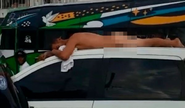 В какой-то момент машину с униженным колумбийцем окружила толпа любопытных зевак, желающих поучаствовать в порицании голого соотечественников. В итоге скопление людей привлекло внимание местной полиции.