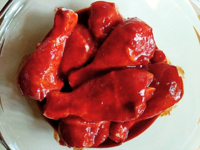 Блюдо корейской кухни - среднеострое и весьма простое в приготовлении. Представляет из себя курицу, тушеную с овощами в остром соусе. Есть несколько вариантов приготовления — можно тушить на плите в глубокой сковороде или в кастрюле, а можно в какой-нибудь огнеупорной посудине с крышкой в духовке. Также есть варианты с использованием разных ингредиентов. Об этом чуть дальше. Ингредиенты: Куриные голени или бедра — 1 кг Картофель — 700-800 гр Морковь — 2 шт Лук репчатый — 2 шт Острый маринад для курицы от Daesang* — половина бутылки *В общем-то, в специализированных магазинах достать этот маринад не проблема. Но можно сделать аналог самостоятельно: в блендер закинуть 150 мл соевого соуса, небольшую луковицу репчатого лука, половину головки чеснока, столовую ложку молотого чили, 50 гр имбиря. Все это перемолоть и получится нечто похожее на оригинальный маринад. Либо есть другой вариант с использованием перцовой пасты Кочуджянг, которую у нас называют, как какую-нибудь армянскую фамилию