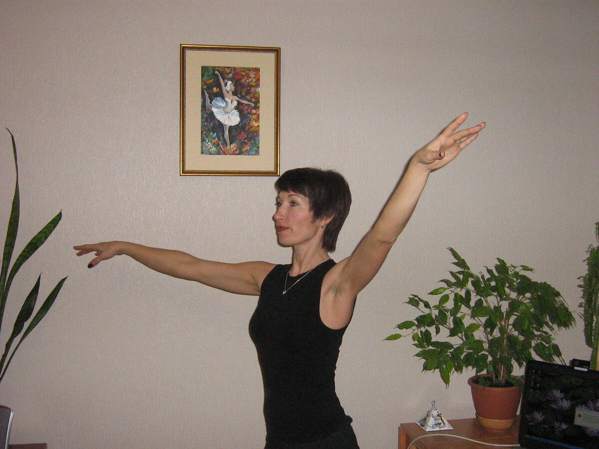И.п. То же. Руки над головой, чтоб видеть кисть руки внутренней стороны ладони, плечи стараемся опустить вниз. Напрячь мышцы плечевого корпуса.
