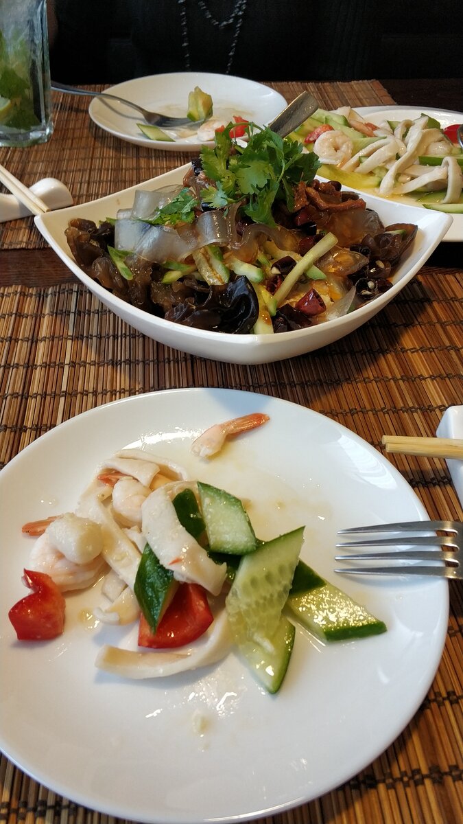 Решили отметить праздник в ресторане китайской кухни и немного с ней познакомиться, так сказать сделать первый шаг. Предварительно почитав отзывы, на соответствующих сайтах и платформах, выбрали ресторан и поехали. Первые наши блюда это два салата, первый морепродукты с огурчиком и болгарским перцем и белым соусом, второй с грибами капустой, огурцами, лапшой и остро-солёным соусом!!! Огонь, оба салата очень вкусные!!!! На гарнир принесли лапшу традиционную, а на горячее мясо свинина с осьминожками. Лапша очень вкусная, а вот свинина жирноватая и на любителя, а осьминожки немного жевательные)))) Но в цело всё было очень вкусно и свежо. Так и прошло наше знакомство с китайской кухней, вообщем положительное. В следующий раз решили большой компанией пойти и заказать утку по-пекински. Всем приятного аппетита, не бойтесь экспериментов, а то не успеете многого попробовать!!!!!